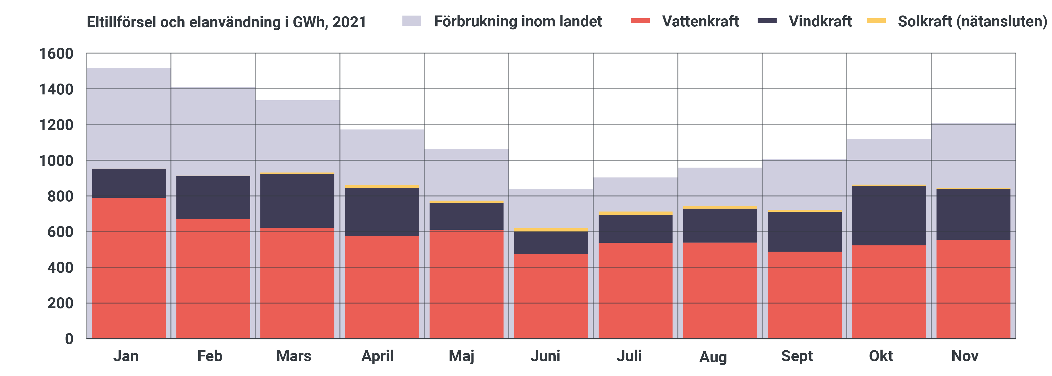 Enligt Energimyndighetens preliminära årssammanställning av elstatistik för 2021 beräknas den totala elproduktionen ha blivit 166 TWh, och elanvändningen landade på 140 TWh. Med alla energikällor inräknade producerar alltså Sverige mer el än vad vi förbrukar utslaget över ett år, men andelen förnybar energi är bara 68%.