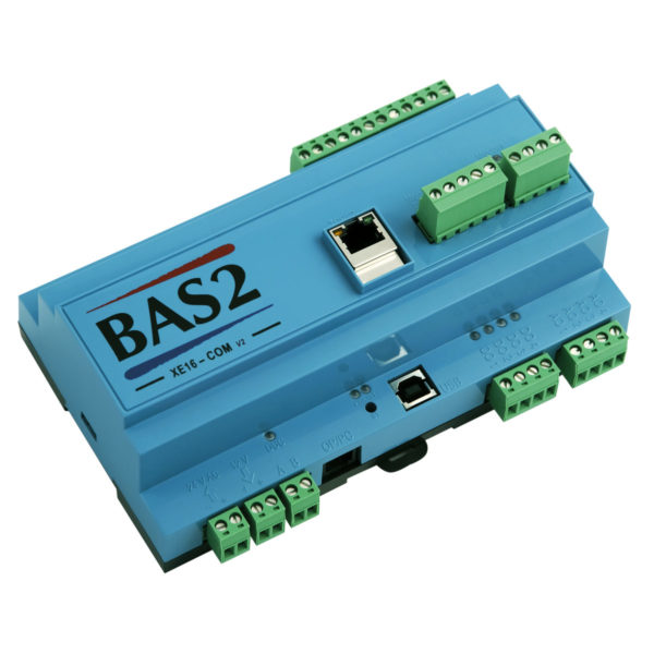 BAS2 XE16-COM is a compact RTU in the BAS2 concept for building automation from Bastec. It has a built-in network connection and a full graphical web server for easy service via a browser. The USB connection provides a quick connection to a laptop. An integrated bracket for DIN rail that fits standard enclosures, even in small applications.